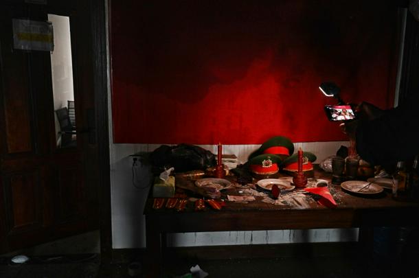 Replica Vietnamese police hats inside an abandoned scam centre in O'Smach town on the Thai-Cambodian border