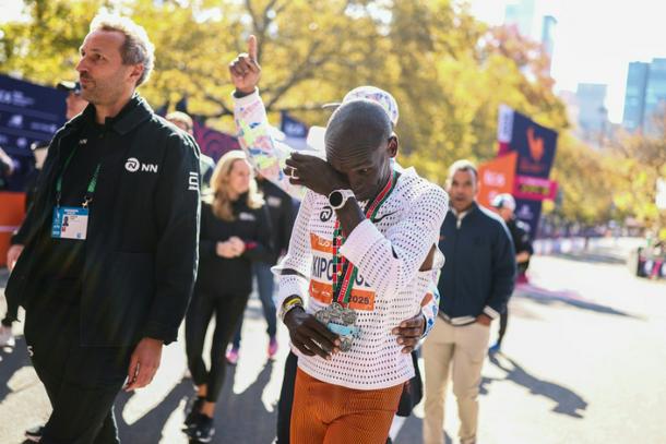 Eliud Kipchoge of Kenya sheds a tear after competing in the 2025 New York Marathon