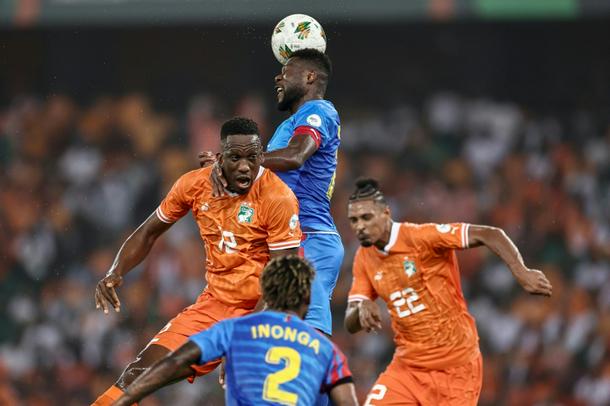 DR Congo captain Chancel Mbemba (C) wins an aerial duel against Ivory Coast in a 2024 Africa Cup of Nations semi-final.