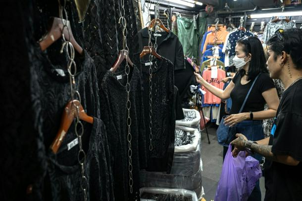 At another stall nearby, vendor Anut Pormsri and his assistant sat scrolling on their phones beneath a sign offering two black shirts for 100 baht.