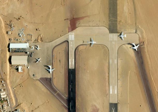 This handout satellite image from 2025 Planet Labs PBC shows the UAE-loyalist airbase in Kufra, southeastern Libya, on October 7, 2025, with four Ilyushin Il-76D aircraft reportedly used to transport weapons and mercenaries to Sudan