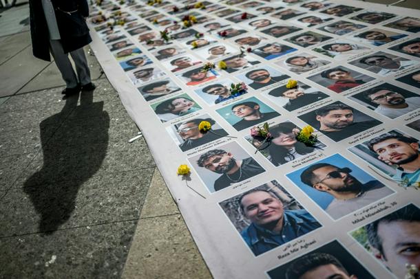 Demonstrators displayed portraits of Iranians killed during recent protests on the sideline of the 61st session of the UN Human Rights Council in Geneva