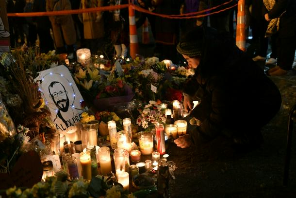 A woman lights a candle while mourning at a memorial where Alex Pretti was shot dead by federal immigration agents in Minneapolis