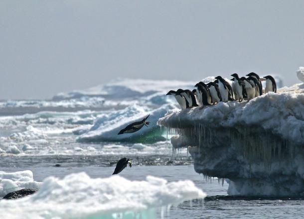 Adélie penguins leap off an iceberg at Danger Islands, Antarctica