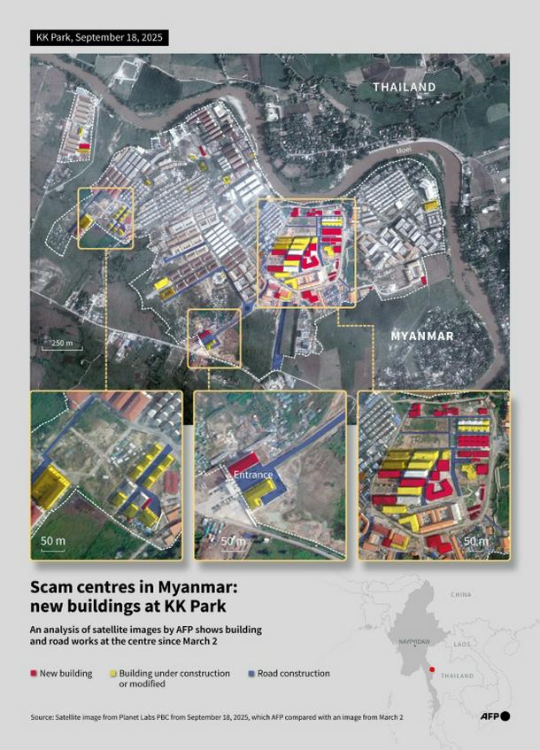 Nonetheless satellite images show what appear to be office and dormitory blocks shooting up in many of the estimated 27 scam centres located along a winding stretch of the Moei River on the Thai-Myanmar border.