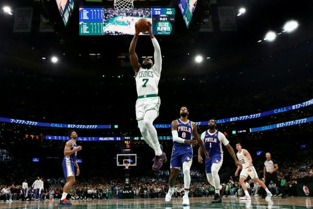 Boston's Jaylen Brown throws down a dunk in the Celtics' victory over the Philadelphia 76ers in their NBA playoff opener