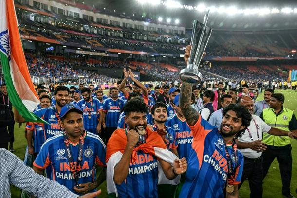 Co-hosts India hammered New Zealand by 96 runs in the final in Ahmedabad on Sunday to be the first team to retain the T20 world crown and first to win it three times.